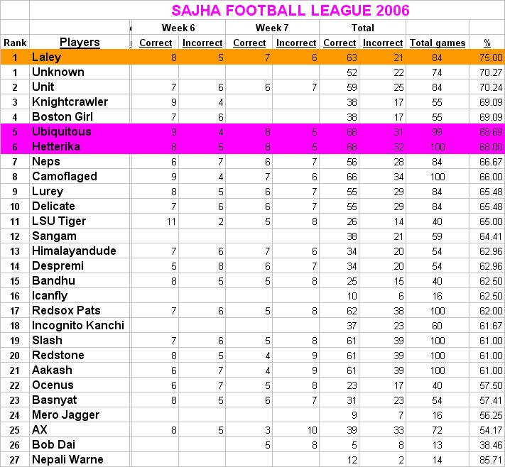 Take ur time slash bro', get ur things done before sajha SCORE BOARD... My picks for this week. Arizona at Green Bay ---------------------> Green Bay Atlanta at Cincinnati ----------------------> Cincinnati ( C. Johnson and CB DeAngelo Hall good match up) Baltimore at New Orleans ----------------> Baltimore (Ray will stop Bush ...Mcnair will show some good offense to Saints) Houston at Tennessee -------------------> Tennessee ( HOME Fiedl) Jacksonville at Philadelphia --------------> Philadelphia (Philly r suppose to be 7-0 not 4-3....unlucky team of the season....... what's up wiht all stupid penalties ... Philly) Seattle at Kansas City --------------------> Kansas City (No Matt Hasselbeck No Seattle) San Francisco at Chicago -----------------> Chicago ( best of luck S.F) Tampa Bay at N.Y. Giants ----------------> N. Y. Gaints St. Louis at San Diego ---------------------> San Diego Indianapolis at Denver --------------------> DENVERRR ( THE BEST GAME OF THE WEEK .....CHAMP BAILEY WILL STOP HARRISON ...DENVER WILL GIVE MANNING ONE TD AND 2 INT. ..CAN'T WAIT TO SEE THIS GAME ) N.Y. Jets at Cleveland --------------------> Cleveland Pittsburgh at Oakland ---------------------> Pittsburgh Dallas at Carolina --------------------------> Carolina (Watch out for T.O. ..don't care what media says about T.O. ...i still love this guy's play New England at Minnesota ---------------> Minnesota