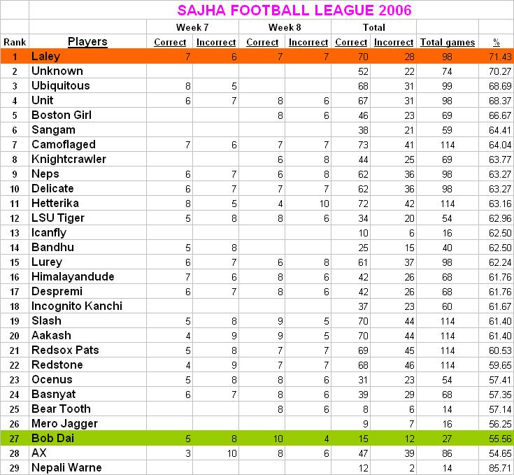 keta keti haru le mero score ma dherai akha lagayo jasto cha... maan my predictions been awful this past couple of weeks. Well let's hope this weeks' prediction will be a better one. Plus had more time today, so am up with the score as well. SFL pundit, Laley