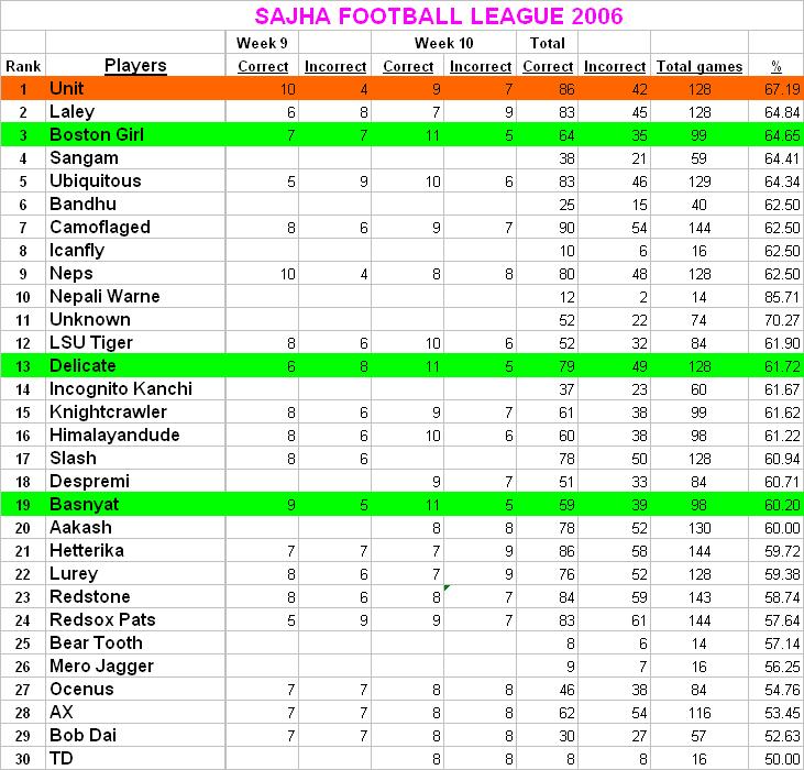SCORE UPDATE................. SCORE UPDATE UNIT is the overall winner, and BOSTON GIRL, DELICATE, BASNYAT are the winners for this week Congratulations to ya'll. redstone, cleveland at atlanta --> ravens..?? what the hell is that? lol hya mora ramrari herera type garr nah. :P:P Week 10 results: Baltimore at Tennessee --------------> Baltimore Buffalo at Indianapolis ---------------> Indianapolis Cleveland at Atlanta -----------------> Cleveland Green Bay at Minnesota -------------> GreenBay Houston at Jacksonville --------------> Houston Kansas City at Miami ------------------> Miami N.Y. Jets at New England ------------> Ny Jets San Diego at Cincinnati ---------------> San Diego San Francisco at Detroit --------------> San Francisco Washington at Philadelphia ----------> Philadelphia Denver at Oakland --------------------> Denver Dallas at Arizona ----------------------> Dallas New Orleans at Pittsburgh ----------> Pittsburgh St. Louis at Seattle -------------------> Seattle Chicago at N.Y. Giants ---------------> Chicago Tampa Bay at Carolina ---------------> Carolina