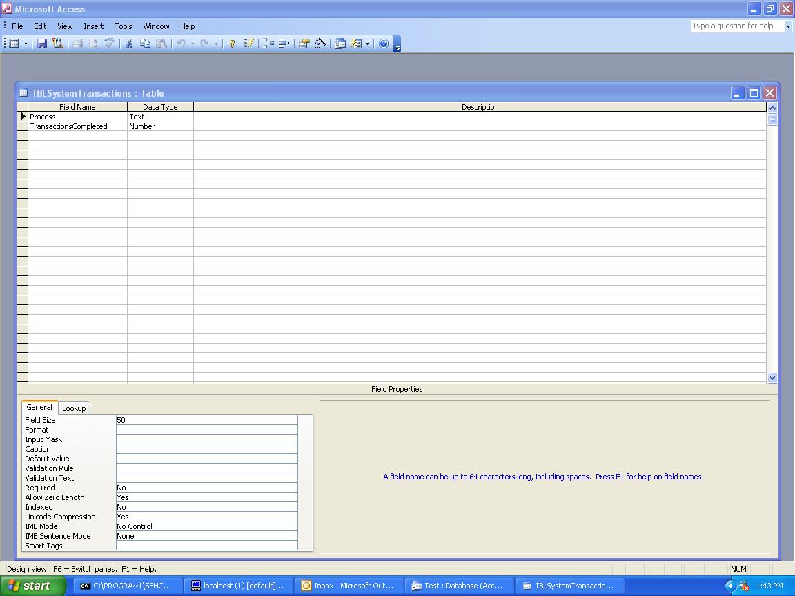 One more thing, I have 4 fields in the table: UserID Process TransactionsCompleted Date Would that be a problem that I'm not including the 2 other column names in the SQL (UserID and Date)?