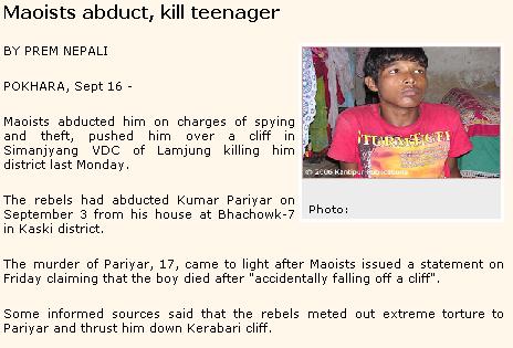 I don't buy that. And "minor discrepancies" you said? Killing teachers is minor discrapancy to you? Not to me. I value all lives, and that's how it is. Secondly, I guess using your logic, supporting Al Qaeda is also okay, since some of the things they advocate--e.g. when they point out the fact that Muslims are being oppressed by the West--do make some sense. After all, dead Americans are just collateral damage to you. Right? Sorry, but the things Maoists have indulged in, like, oh i don't know, killing people, totally trumps whatever positive things they bring to the table. Now, don't get me wrong, I do want a truce of some form or another, but the bottomline is that they're terrorists. Now, I have never supported the King, never will. As I said, I want a democracy. However, I do feel that the King was unpopular because of some specious rumors they spread about him. For example, the notion that Gyanendra was responsible for Birendra's death. Wanna bet that this lie was promulgated by Maoists and Co? Even to this day, most Nepalis still believe that Gyanendra is responsible for Birendra's death. I mean, since when did Birendra become a hero? Gyane was a dumbass no doubt. He had to grab power and that just added to his unpopularity. He's just stupid. It doesn't matter what they, the Maoists, iterate or reiterate, given the history of commies all around the globe. What they advocate or preach isn't necessarily always what they actually support or want to happen. That's a pretty fine difference, my friend. I am not gonna read about Prachanda Path[seems heavily borrowed from the Shining Path], because I am not going to fall for clever rhetoric. And please do not use the Panche card with me, because I do not support royals. Panches have killed people, and so have Maoists. They're two sides of the same coin.