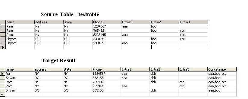 I have a sql question. Please take a look at the table image. I need to have result table with additional field that has concatinated value of Extra1, Extra2, Extra3 when name, address and state match. I have written this way but did not get correct result. select * from testtable order by name drop table #table1 SELECT *, case when (rtrim(Extra1) is not null and rtrim(Extra1) <>'') then rtrim(Extra1) else '' end + case when (rtrim(Extra2) is not null and rtrim(Extra2) <>'') then ',' + rtrim(Extra2) else '' end + case when (rtrim(Extra3) is not null and rtrim(Extra3) <>'') then ','+ rtrim(Extra3) else '' end as Concatinated into #table1 FROM testtable y select * from #table1 order by name update #table1 set Concatinated = rtrim(y.Extra1) + ',' + rtrim(y.Extra2) + ',' + rtrim(y.Extra3) from testtable y, #table1 x where rtrim(y.name) = rtrim(x.name) and rtrim(y.address) = rtrim(x.address) and rtrim(y.state) = rtrim(x.state) select * from #table1 order by name
