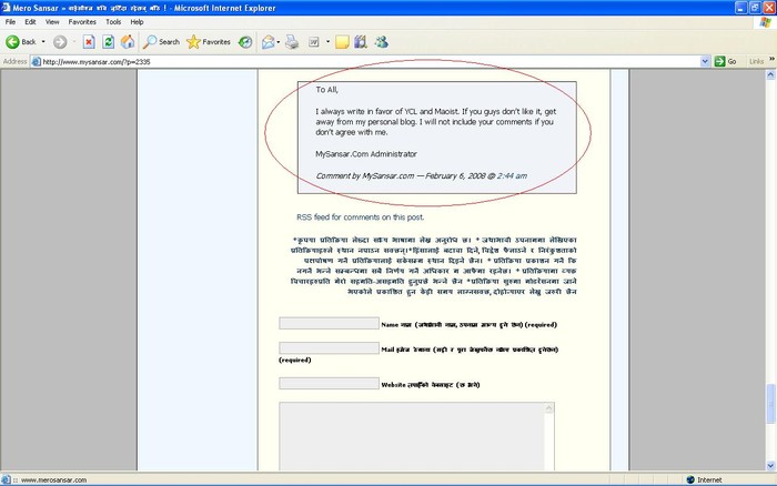 i used to see his blog during april movement, it was good then but later on when i found that it was a maoist blog i no more visit there. just ignore that those who are financially and morally supporting him are maoist/terrorist/YCL cadres lets help those cadres out of here to mysansar.com