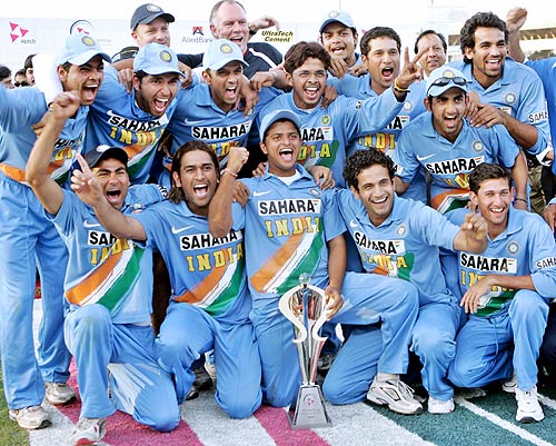 The victorious Indian team pose with the ODI series trophy, Pakistan v India, 5th ODI, Karachi, February 19 2006